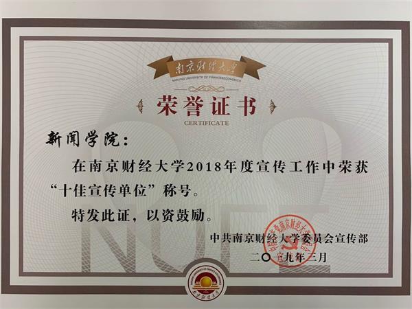 我院获得学校2018年度“十佳宣传单位”荣誉称号