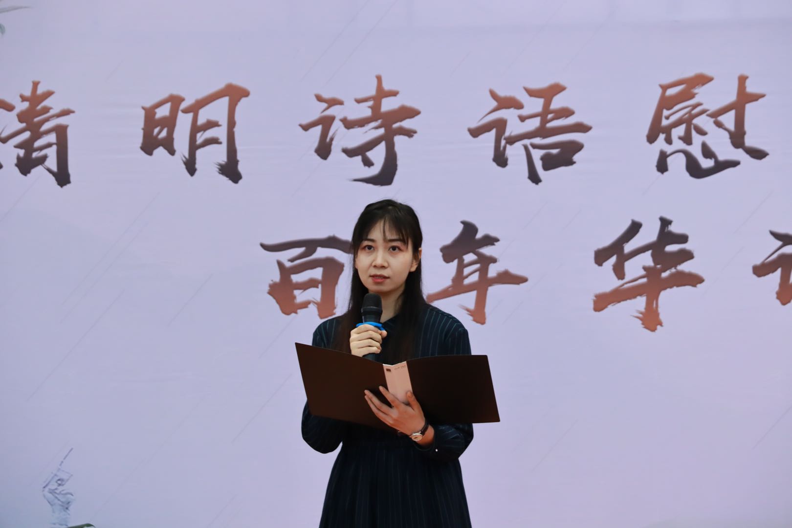 “今日在篱下,山花烂漫,春荣如是。临近清明雨纷纷,缅怀先烈忆忠魂。”新闻学院分团委书记李晞老师一首娓娓道来的《清明追忆》拉开了诗会的序幕,将现场师生带入了肃穆缅怀的情境中。接着,张棕翔同学声情并茂地朗读了《冷少农烈士家书》,轻轻表露这位早期隐蔽战线的英雄,面对家人误解却又无怨无悔的内心世界“母亲,我真的是不忠不孝,忘恩负义吗?我是把我的孝移去孝顺大多数痛苦的人类,忠实的去为他们努力。”陶佳洁和李博伟两位老师合作朗诵了陈觉和赵云霄革命伉俪在为人民解放事业献出生命时的遗书,真切表达了对爱人对女儿的真情与嘱托。马驭同学的演讲《缅怀永远不能忘却的伟人》和集体诗朗诵《毛泽东诗词三首》缅怀了党和人民共和国的伟大缔造者毛泽东主席,用铿锵有力的诗句让大家感受到伟大领袖的思想风范。秦曼科同学的主题演讲《传承先烈遗志,做新时代中国青年》与赵妮妮同学的朗诵《新时代的赞歌》将师生们的思绪从历史的深深怀思中带到了繁荣奋进的新时代。“有一首歌,鼓起理想的风帆,填平征途的沟壑……”伴随着最后一首诗朗诵《有一首歌》,现场气氛达到高潮,在全场师生共同演唱《没有共产党就没有新中国》的激昂旋律中,诗会圆满结束。