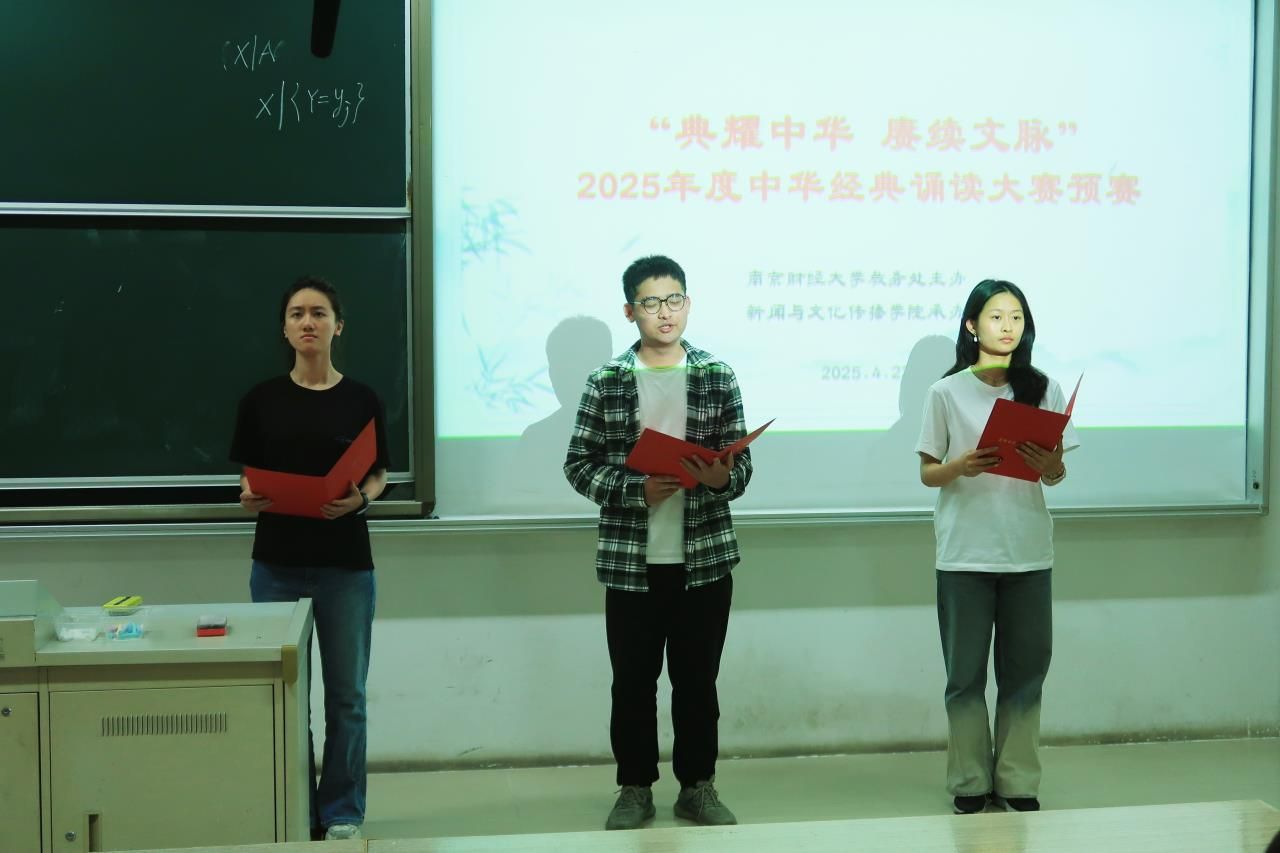 4月23日晚,由南京财经大学教务处主办、新闻与文化传播学院承办的南京财经大学“典耀中华 赓续文脉”2025年中华经典诵读大赛初赛在博远楼108顺利举行。新闻学院副院长刘霞云,诵读大赛指导教师赵娜、张勇丽、田莺、左凡等作为评委团队老师参加活动。
